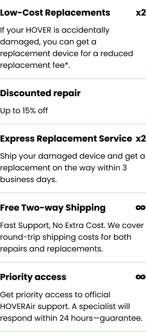 We stand behind our products & services with reassuring guarantees. HOVERAir offers a 24-month limited warranty as required by law.